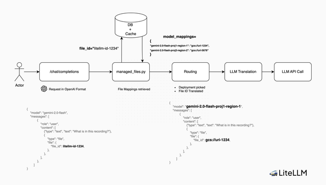 LiteLLM stores a mapping of the litellm file id to the model-specific file id in the postgres DB. When a request comes in, LiteLLM looks up the model-specific file id and uses it in the request to the provider.